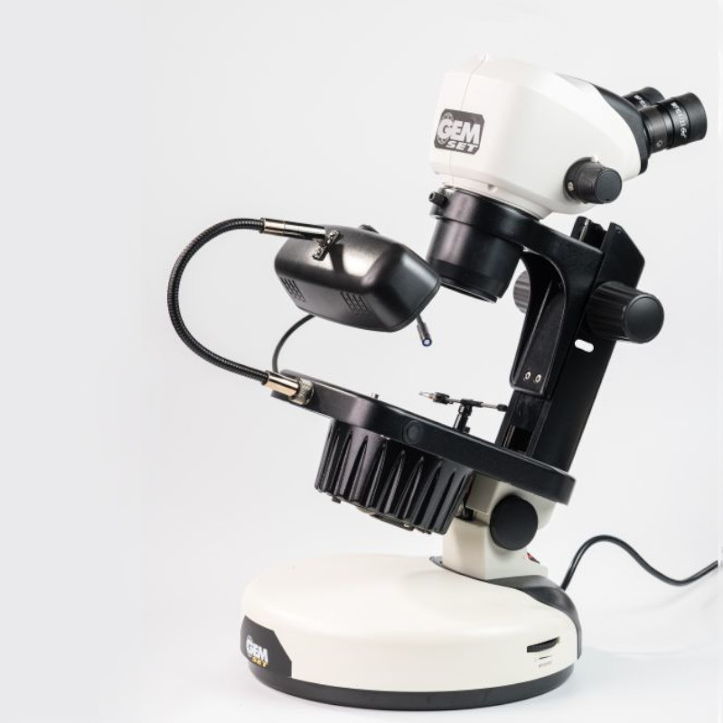 Professional gemmological gemscope ergonomically designed to adapt the microscope to all working postures. It features a ball bearings rotating foot to position the equipment easily and quickly and a tilting system to ensure maximum comfort in any working condition and to adapt the asset to the seat height. The working table is equipped with pivoting tweezers and an iris diaphragm to control the light flow on the gemstone, both with dark or bright field observation.